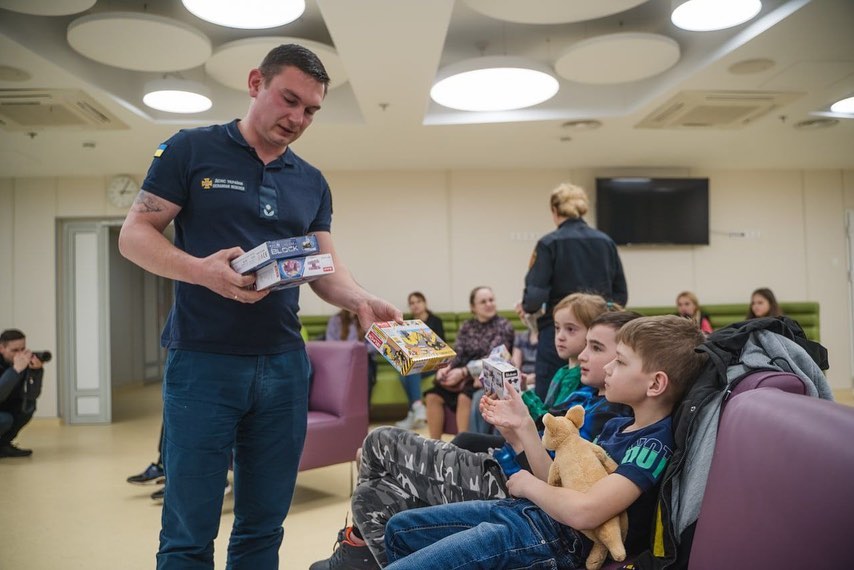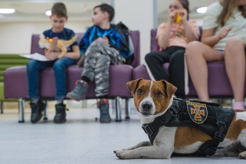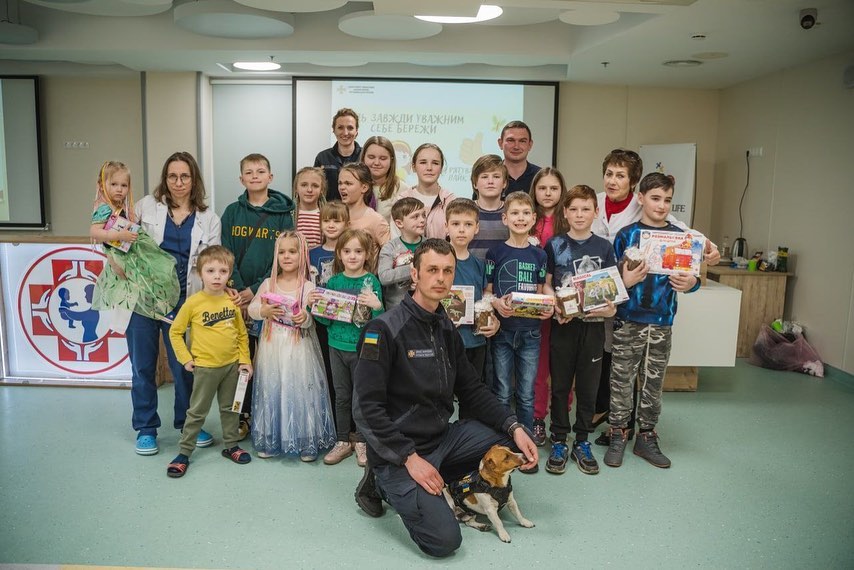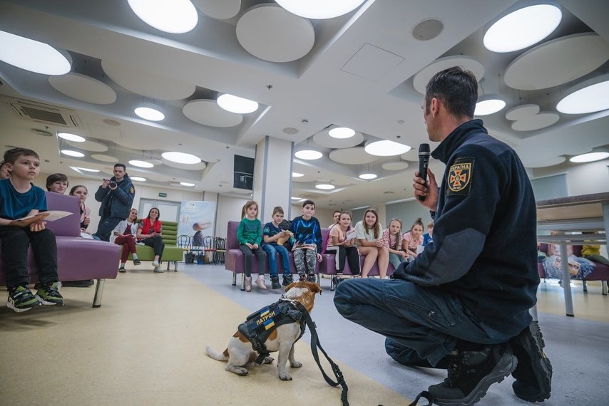 Пес Патрон навестил детей в столичном Охматдете. Героический малыш рассказал маленьким украинкам и украинцам об актуальных угрозах и как действовать при чрезвычайных ситуациях.