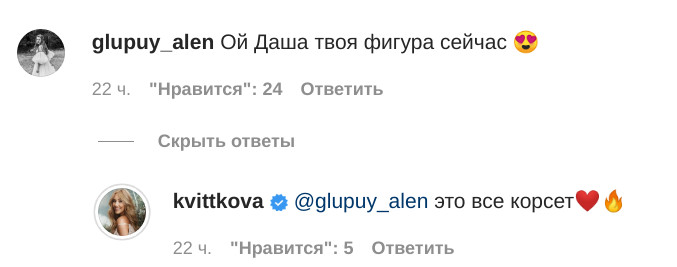 Пользователи сети засыпали Квиткову комплиментами о том, как быстро она вернулась в идеальную форму после родов. Блогер, которая ранее рассказывала о том, что мечтает похудеть еще на 10 кг, призналась, что обязана стройным видом корсету.