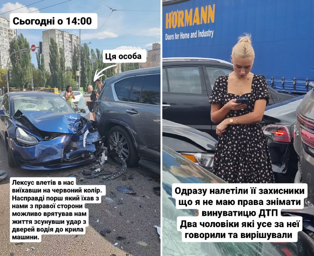 "На самом деле Porsche, ехавший с нами с правой стороны, возможно, спас нам жизнь, сдвинув удар с двери водителя к крылу машины, - говорила Лилия. - Сразу налетели ее защитники, что я не имею права снимать виновницу ДТП. Два мужчины, которые все за нее говорили и решали".