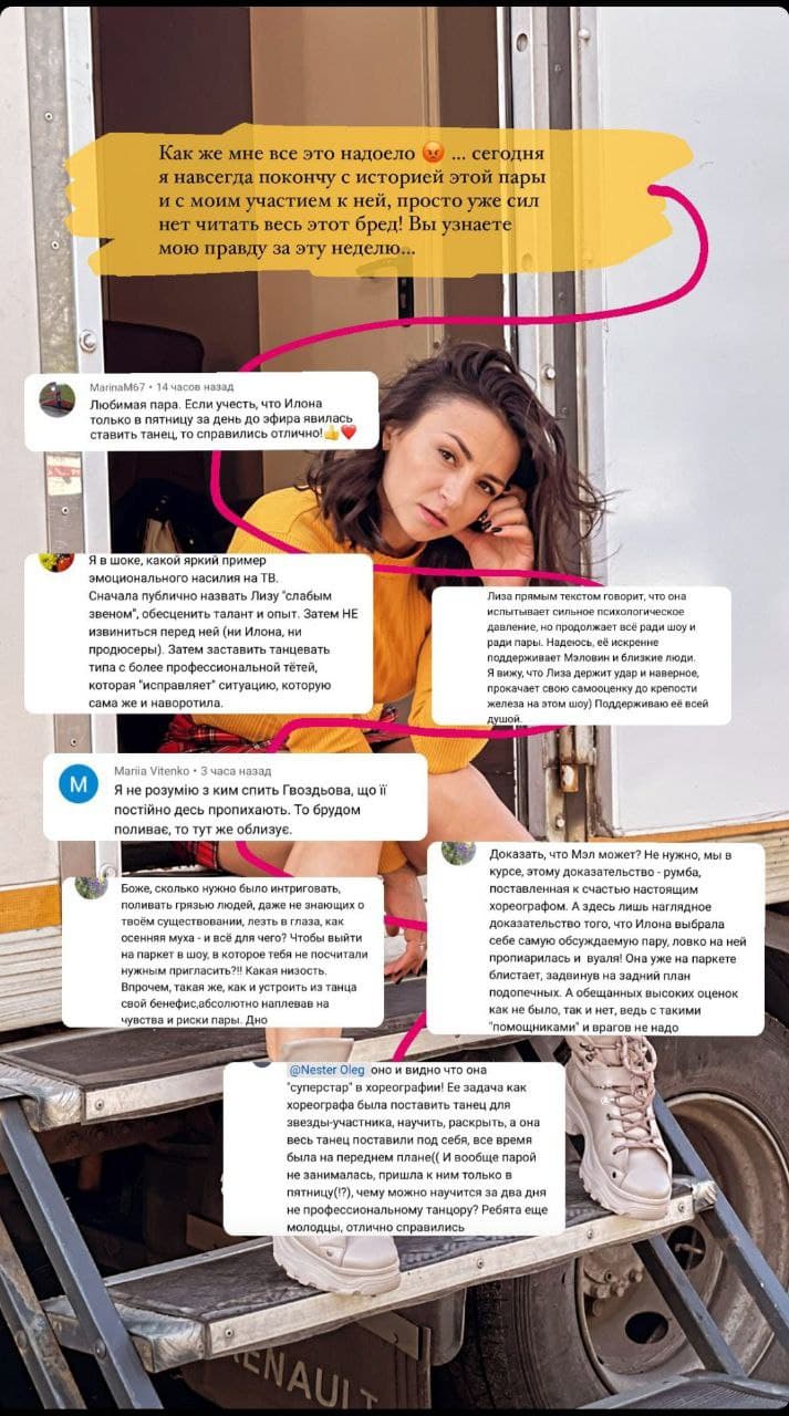 Сама Лиза Русина в видеодневнике призналась, что согласилась работать с Илоной Гвоздевой только ради MELOVIN"а и намекнула на лицемерие танцовщицы. "Она может улыбаться в лицо и говорить, что все хорошо, а потом приходит домой, включает свои сториз и начинает меня обливать", - сказала участница "Танців з зірками".