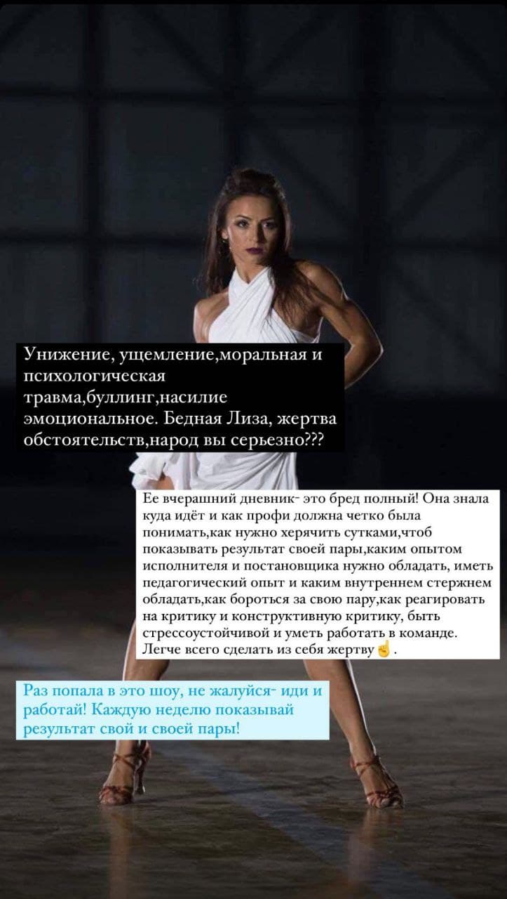 "Унижение, ущемление, моральная и психологическая травма, булинг, насилие эмоциональное. Бедная Лиза, жертва обстоятельств, народ, вы серьезно?! - написала танцовщица. - Ее вчерашний дневник - это бред полный. Она знала, куда идет, и как профи должна была четко понимать, как нужно х***чить сутками, чтоб показать результат своей пары. Каким опытом исполнителя и постановщика нужно обладать, иметь педагогический опыт и каким внутренним стержнем нужно обладать, как бороться за свою пару, как реагировать на критику и конструктивную критику, быть стрессоустойчивой и уметь работать в команде. Легче всего строить из себя жертву. Раз попала в это шоу - не жалуйся, иди и работай! Каждую неделю показывай результат своей пары!"