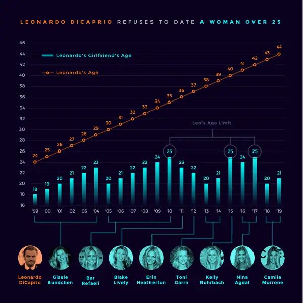 Теперь пара не вместе, и в сети вновь всплыла теория, что ДиКаприо не встречается с девушками старше 25 лет. Так, американский писатель Ник Маджиулли опубликовал в Twitter график, на котором прослеживается подозрительная закономерность.