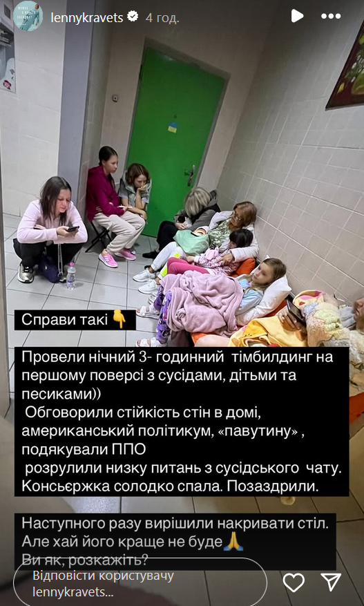 В Instagram-историях бывшая звезда "Квартала 95" показала фото из укрытия, где также прятались ее соседи. Несмотря на напряженную ситуацию, актриса описала этот опыт с присущим ей юмором и иронией.