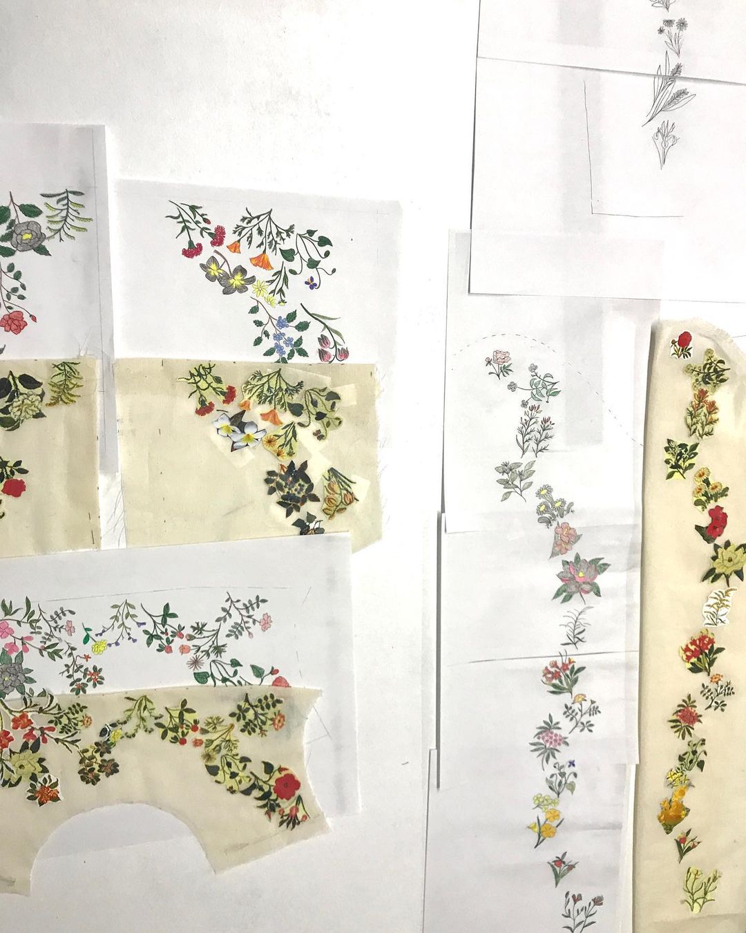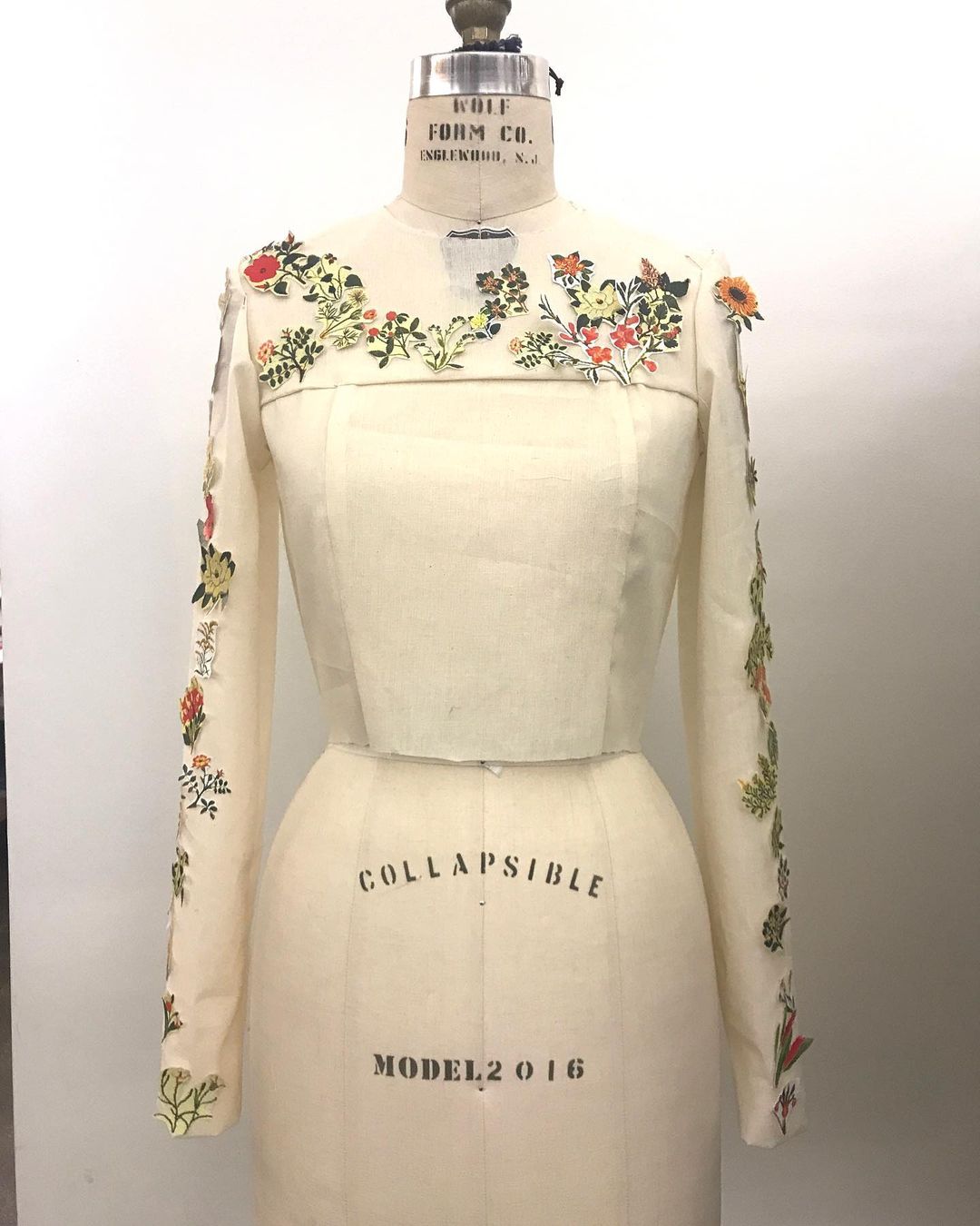 Вечерний наряд для первой леди Америки был полностью изготовлен в Нью-Йорке. Вышивку и пальто создали в швейном отделе - на вышивку каждого цветка уходило от двух до четырех часов. Размещение орнамента продумывалось несколько недель. Платье было собрано в собственной студии бренда.
