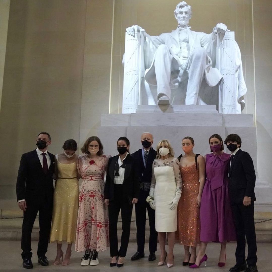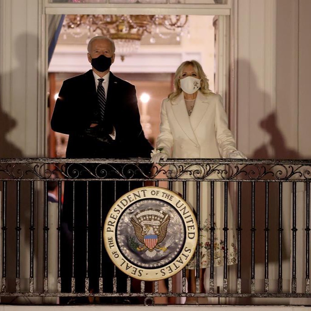 После инаугурации президент США с супругой отправились на вечерний прием. Для мероприятия Джилл Байден надела белый наряд, состоящий из платья и пальто с цветочной вышивкой. Ансамбль изготовлен на заказ мастерской дизайнера Gabriela Hearst, и наполнен символизмом.
