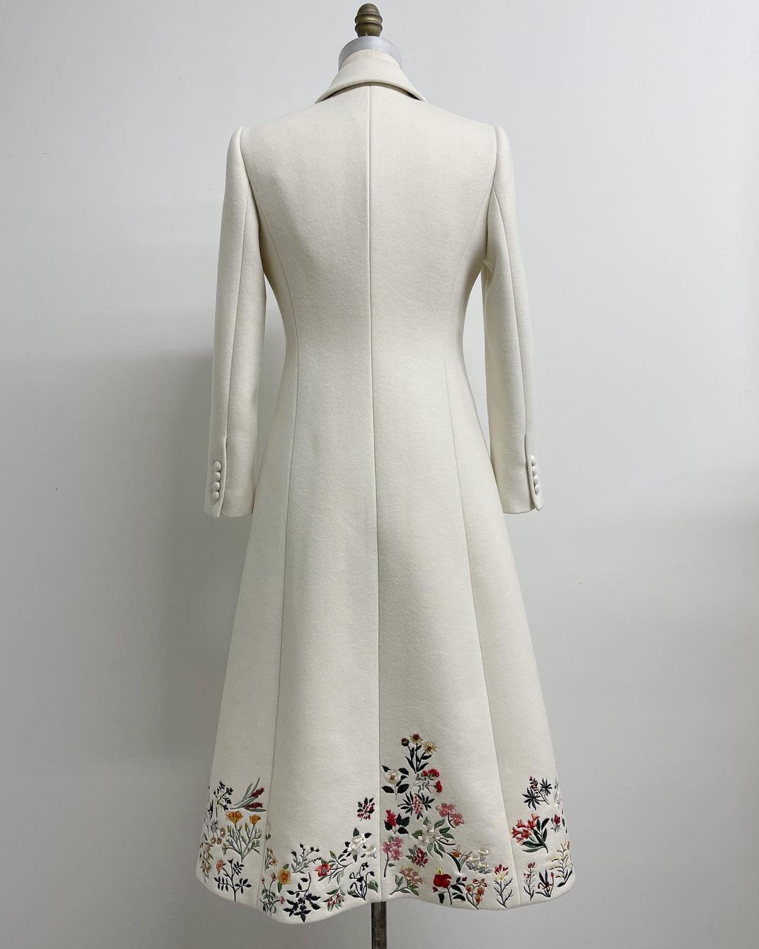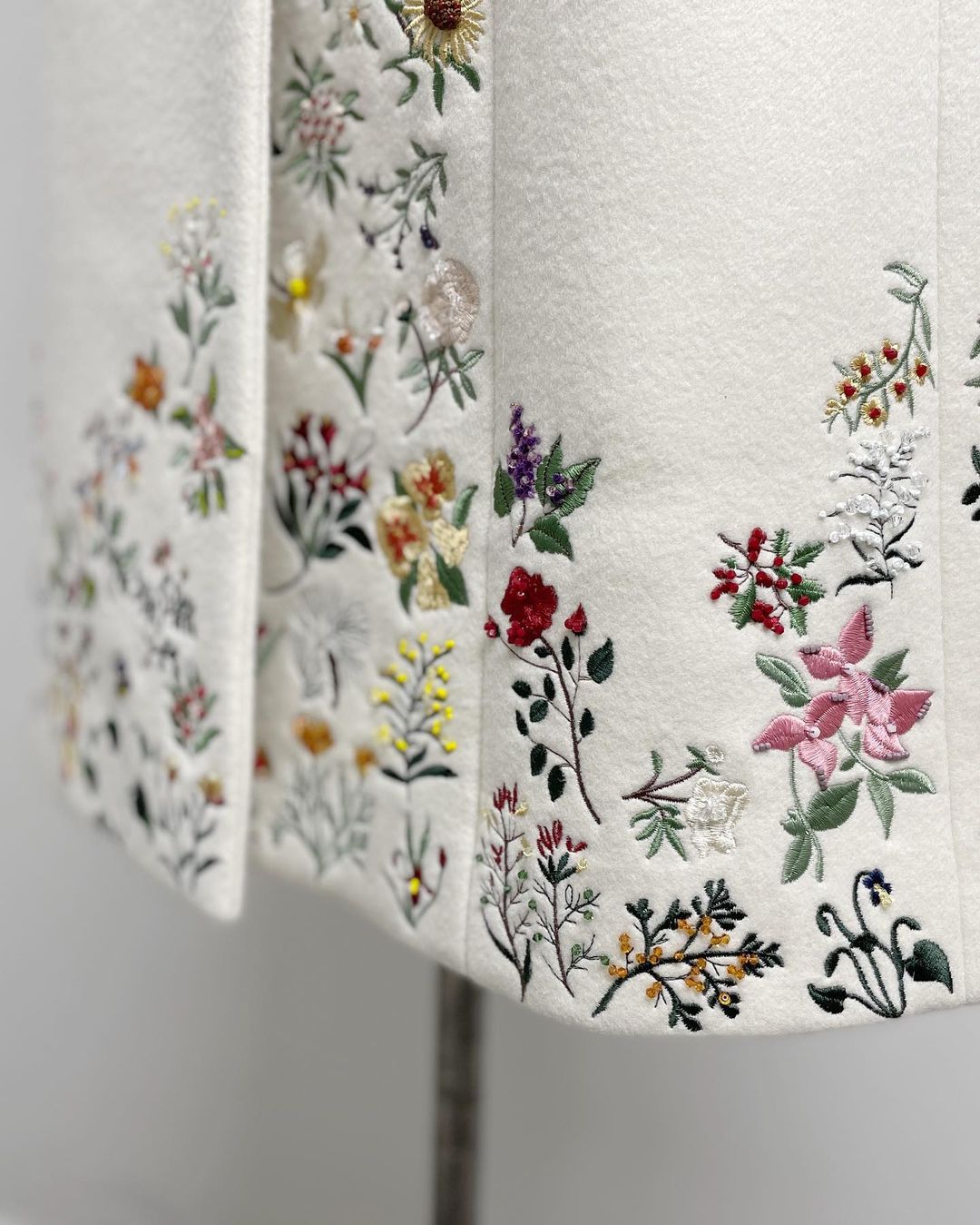 Такая же вышивка украшала и пальто. Узор расположен на краю подола, а затем органично перемещается на боковые швы. Как объяснила модельер, это не просто цветы. Флористический орнамент отражает федеральные цветы из всех штатов и территорий США. На уровне сердца Джилл Байден вышили цветок персика - это символ штата Делавэр.