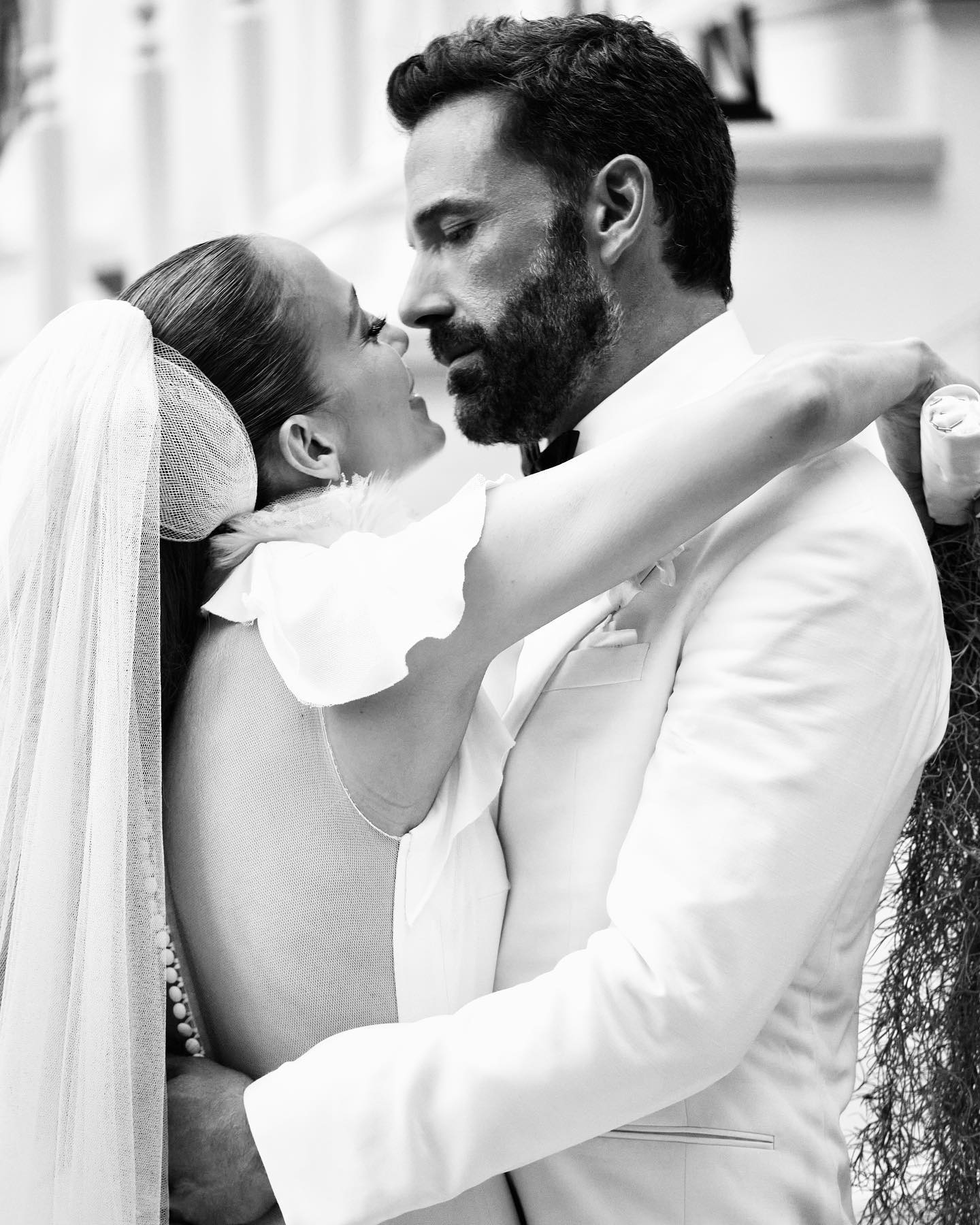 Лопес показала две фотографии своей романтической свадьбы с Аффлеком. На одной актер несет счастливую невесту на руках, а на другой они целуются на фоне праздничных салютов.