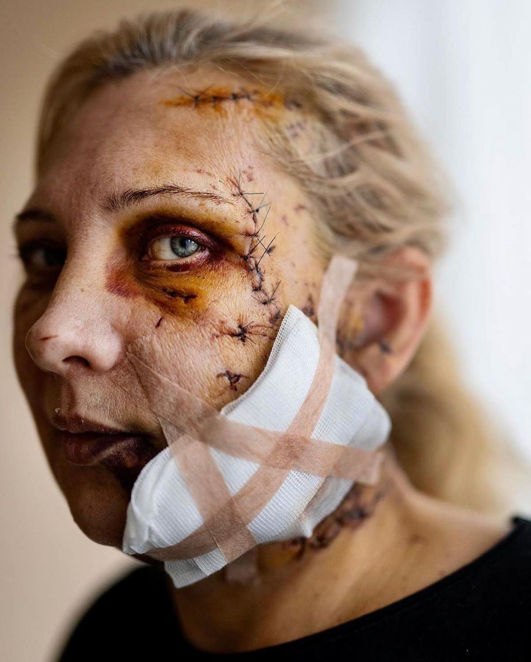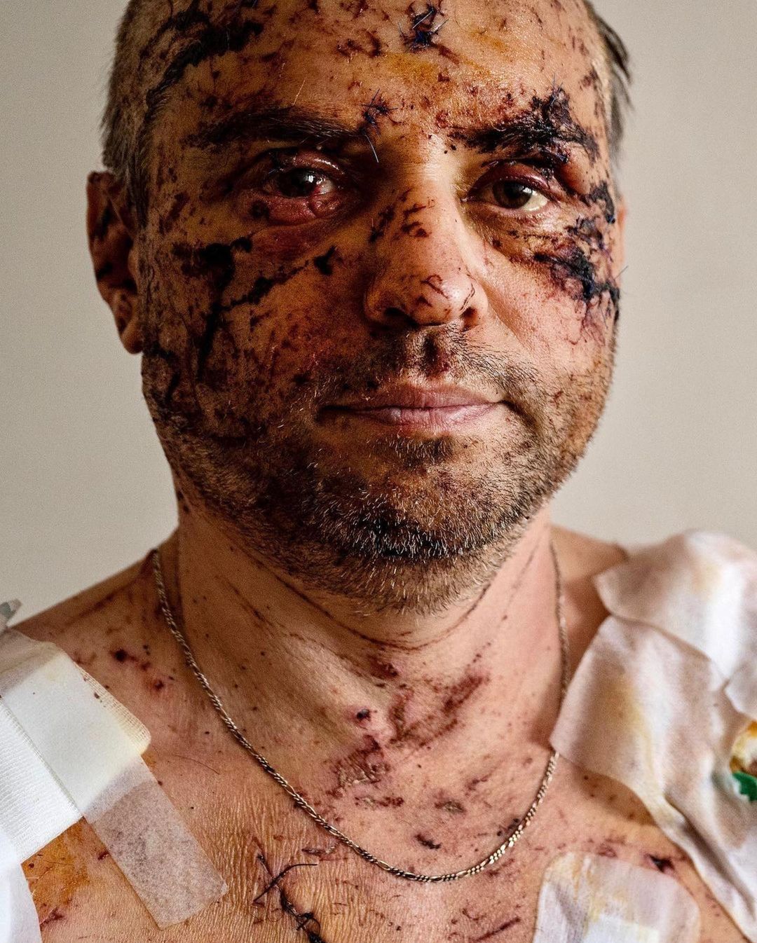 "На первых двух изображениях: Ольга Афанасьева и ее муж Олег Валовой, которые сфотографировались в больнице. Когда попала ракета, они сидели за своим кухонным столом: она левой стороной к окну, а он лицом к окну, - говорится в посте. - Взрыв вынес окно, а стекло и обломки раздробили половину лица Афанасьевой, но ее муж взял на себя весь удар".