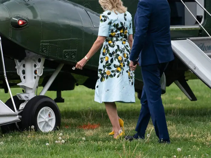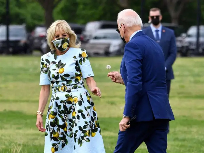 69-летняя Джилл была одета в голубое платье с принтом в виде листьев и апельсинов, маску для лица из такой же ткани и желтые туфли на высоком каблуке. Байден - в темно-синий костюм и черную маску.