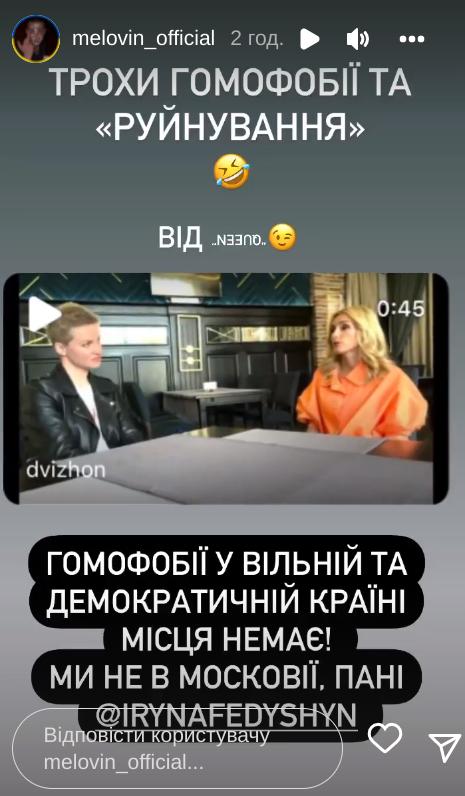 На одиозные высказывания исполнительницы уже отреагировали некоторые представители украинского шоу-бизнеса. Так, певец MELOVIN, который является открытым бисексуалом, напомнил Ирине, в какой стране она живет.