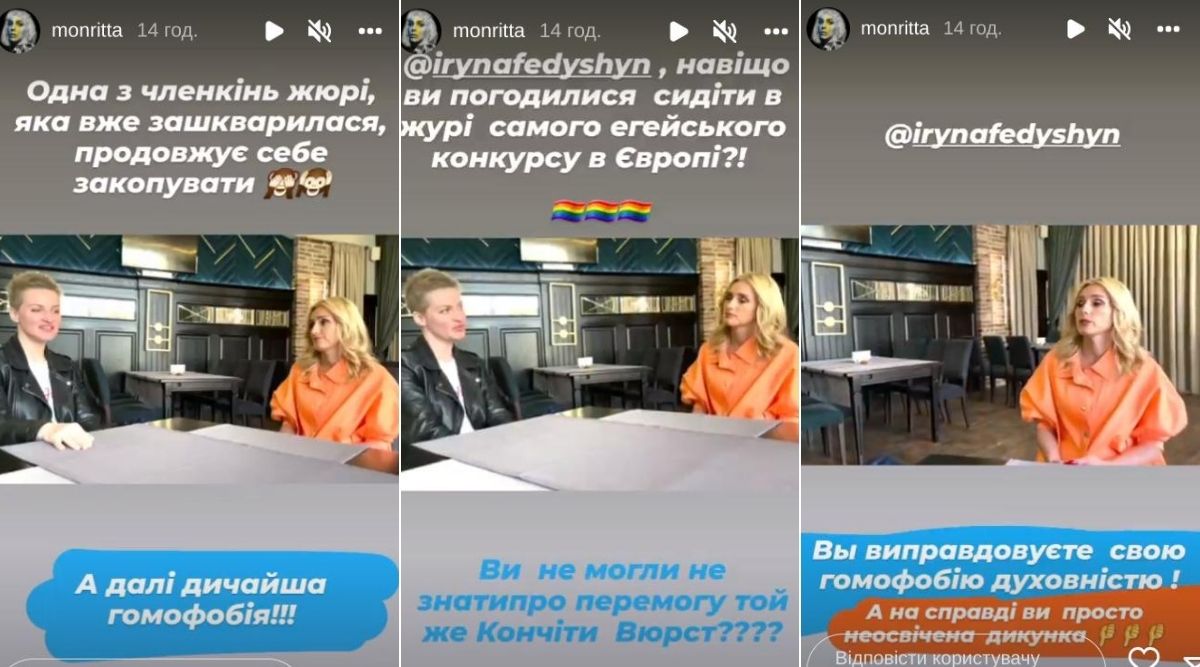 "Одна из уже зашкварившихся членов жюри продолжает себя закапывать. Дикая гомофобия! Ирина, зачем вы согласились сидеть в жюри наиболее эгегейского конкурса в Европе? Вы не могли не знать о победе той же Кончиты Вурст? Вы оправдываете свою гомофобию духовностью! А на самом деле вы просто невежественная дикарка, - заявила Монро в Instagram-историях. - Большое спасибо за все, что делает духовная Ирина и ее семья для Украины, но это не индульгенция от зашкваров, путаницы в показах и непрофессиональных действий!"