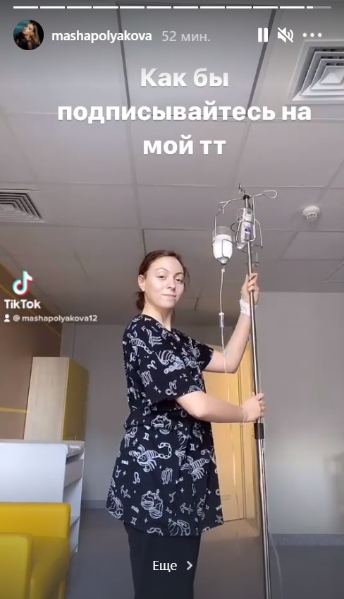 Вскоре на странице Поляковой-младшей появились фотографии с капельницей. В коротком видео девушка призналась, что ей скучно и очень хочется фастфуда.