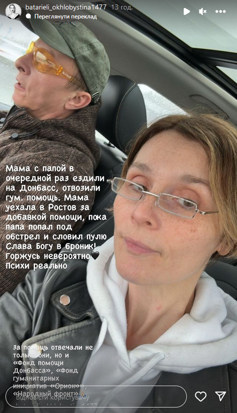 "Мама с папой в очередной раз ездили на Донбасс, отвозили гумпомощь. Мама поехала в Ростов за добавкой помощи, пока папа попал под обстрел и поймал пулю. Слава Богу в броник! Горжусь невероятно. Психи реально", - написала дочь путиниста в "сториз".