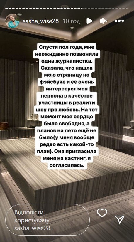 "Мне неожиданно позвонила по телефону одна журналистка. Сказала, что нашла мою страницу на Facebook и ее очень интересует моя персона в качестве участницы в реалити шоу о любви. На тот момент мое сердце было свободно, а планов на лето еще не было... У меня вообще редко есть какой-то план. Она пригласила меня на кастинг и я согласилась", - написала девушка в Instagram-stories.
