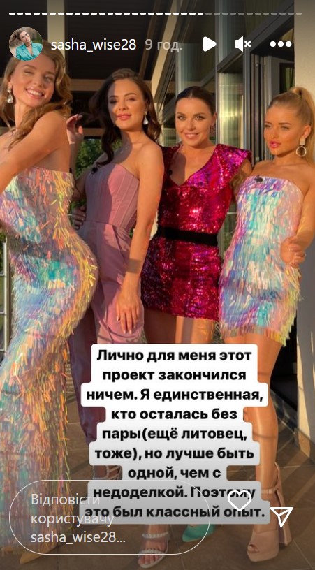 "Было 8 украинок и сколько-то там литовцев, точно не помню, потому что каждый день приходил новый, а кого-то из старых девочек нужно было отправлять домой. Было прикольно… Но лично для меня этот проект закончился ничем. Я единственная, кто остался без пары (еще литовец тоже), но лучше быть одной, чем с недоделкой. Поэтому это был классный опыт", - отметила украинка.