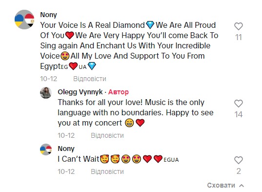 "Спасибо за вашу любовь! Музыка – это единственный язык, не имеющий границ", - ответил Винник.