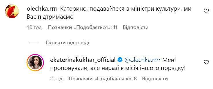 "Екатерина, подавайте в министра культуры. Мы вас поддержим", - написали пользователи сети. "Мне предлагали, но сейчас есть миссия другого порядка!" – заявила в ответ на комментарий звезда.