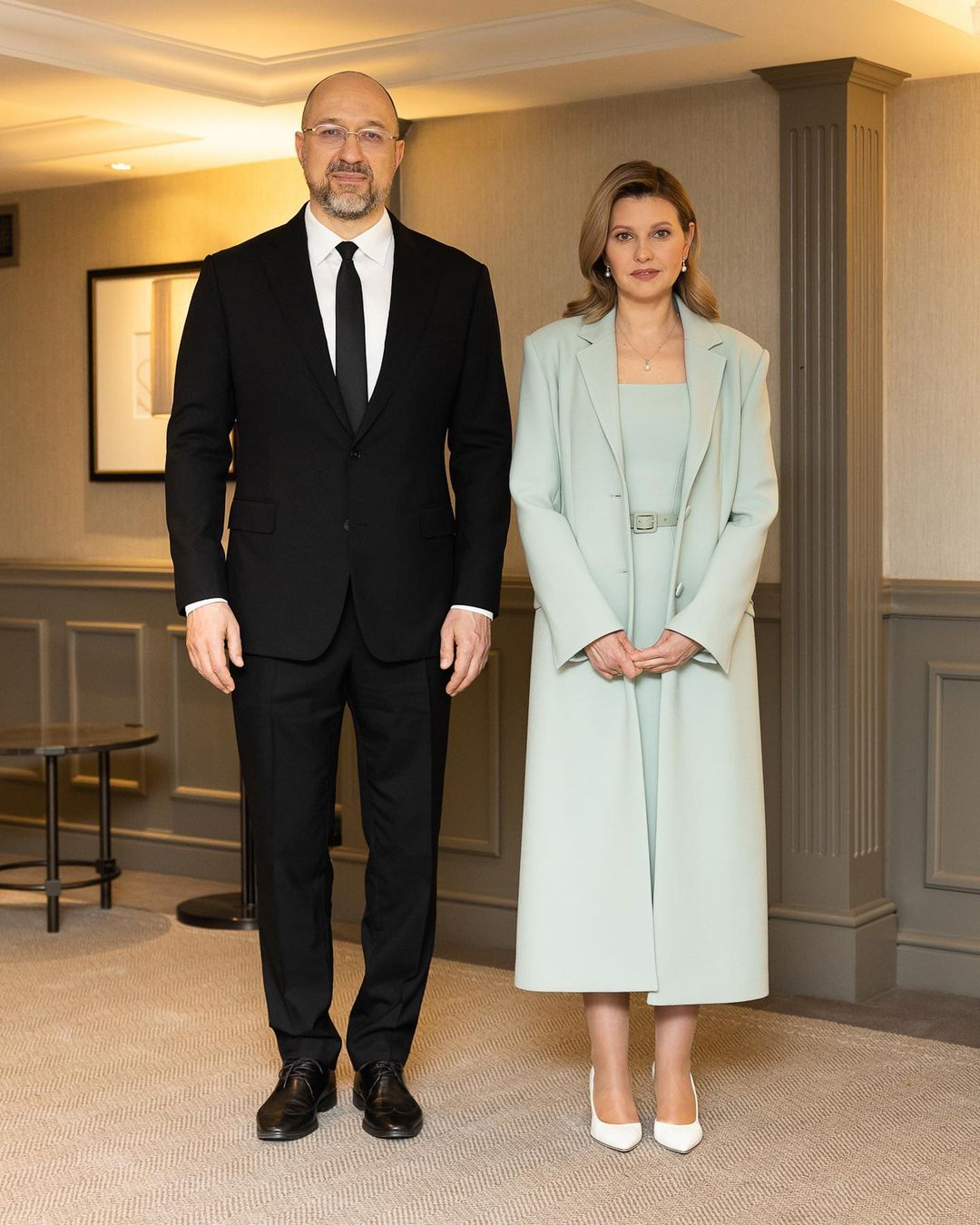 На коронацию Чарльза Елена Зеленская надела платье с поясом и пальто мятного оттенка украиснкого бренда The COAT. Образ первой леди дополнили украшения с жемчугом и белые туфли-лодочки. Денис Шмыгаль появился на мероприятии в черном костюме, белой рубашке и черном галстуке.