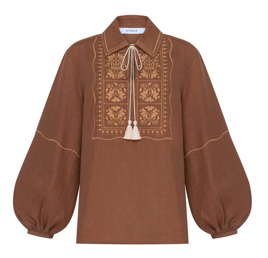 Фото нового образа жены президента можно рассмотреть на фотографиях, обнародованных в ее соцсетях и в Telegram-канале. В кадре Елена Зеленская позирует в коричневой вышиванке украинского бренда Etnodim. Льняная блуза, расшитая узорами охряного оттенка, называется "Тризуб".