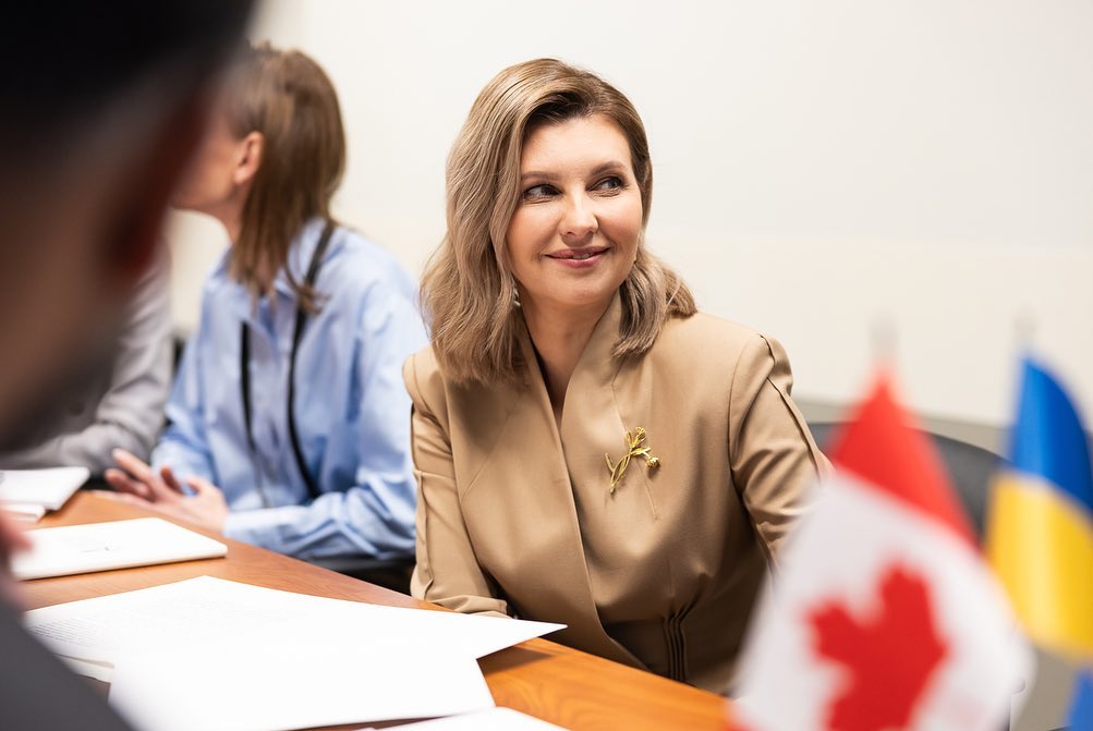 Дли визита в Канаду Елена Зеленская выбрала стильный костюм песочного цвета. Наряд состоял из модных брюк палаццо и жакета без лацканов приталенного силуэта с выточками для создания еще большего акцента в области талии. Образ первая леди дополнила символической брошкой под названием "Полин, Євшан-Зілля" украинского дизайнера Руслана Багинского.