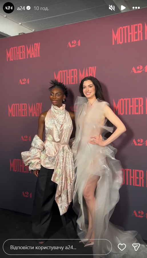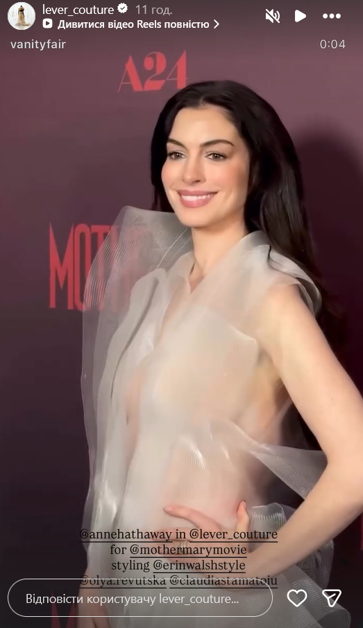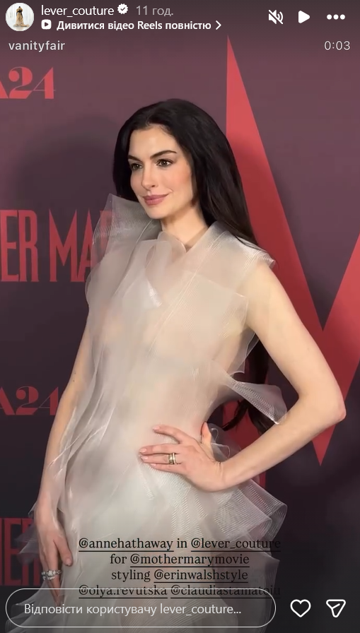13 апреля в Нью-Йорке состоялась презентация психологического триллера студии A24 "Мать Мария", в котором главную роль исполнила Энн Хэтэуэй. На премьере фильма актриса привлекла к себе особое внимание, появившись в наряде украинского бренда Lever Couture.