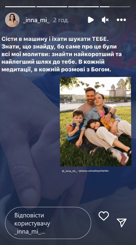 "Сесть в машину и ехать искать тебя. Знать, что найду, потому что именно об этом были все мои молитвы: найти кратчайший и самый легкий путь к тебе. В каждой медитации, в каждом разговоре с Богом", - поделилась Инна своими эмоциями.