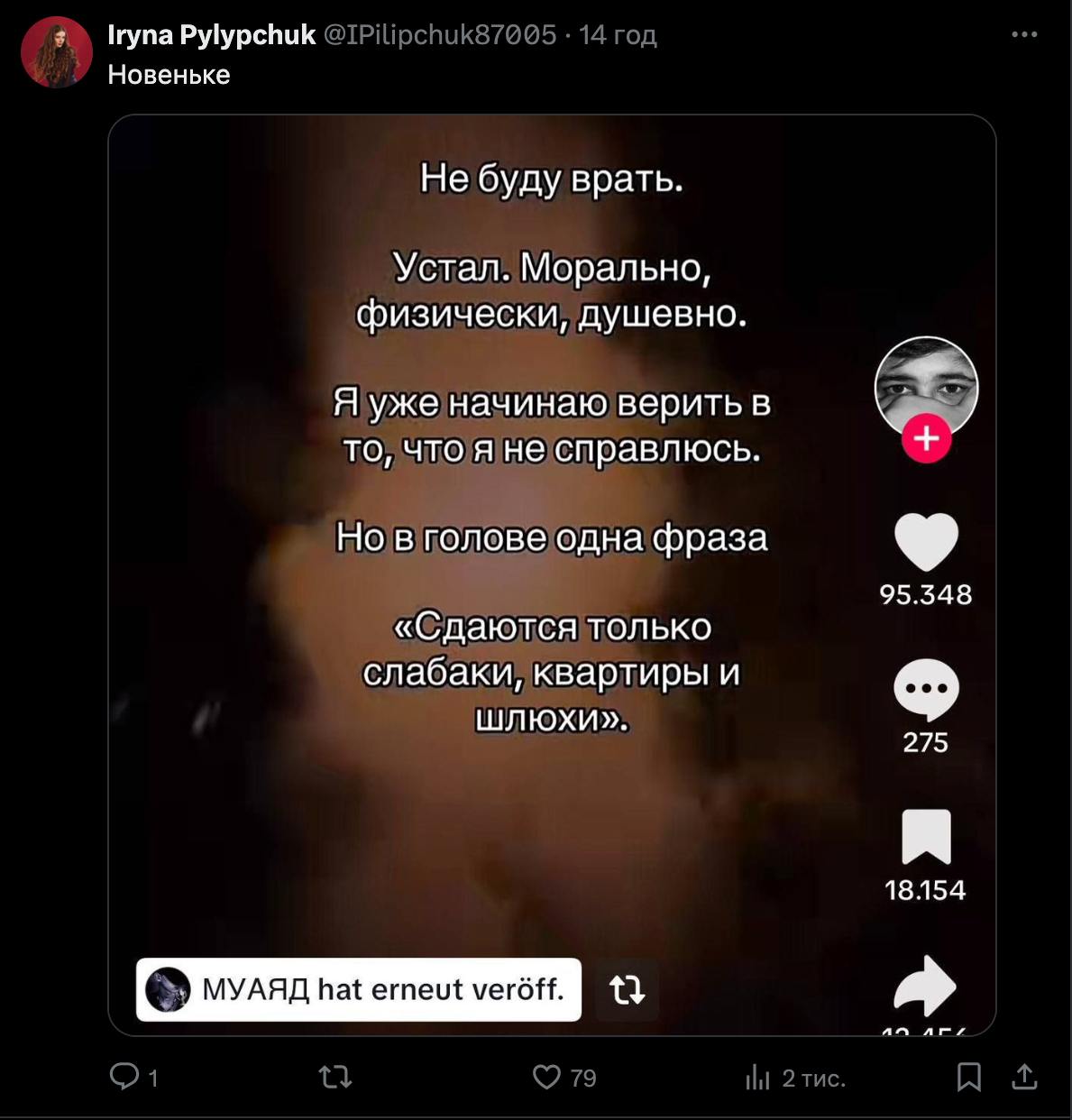 "Это бл*ха минус ТикТока, что тебе в ленту пихают репосты других людей. Типа подписался на укр артиста Муаяда, и бац - повылазили руснявые видосы. Блин, ну хотя бы смотрите в ничку, не засоряйте ленту своих подписчиков этим гимном. А лучше вообще не смотрите", - говорится в публикации.