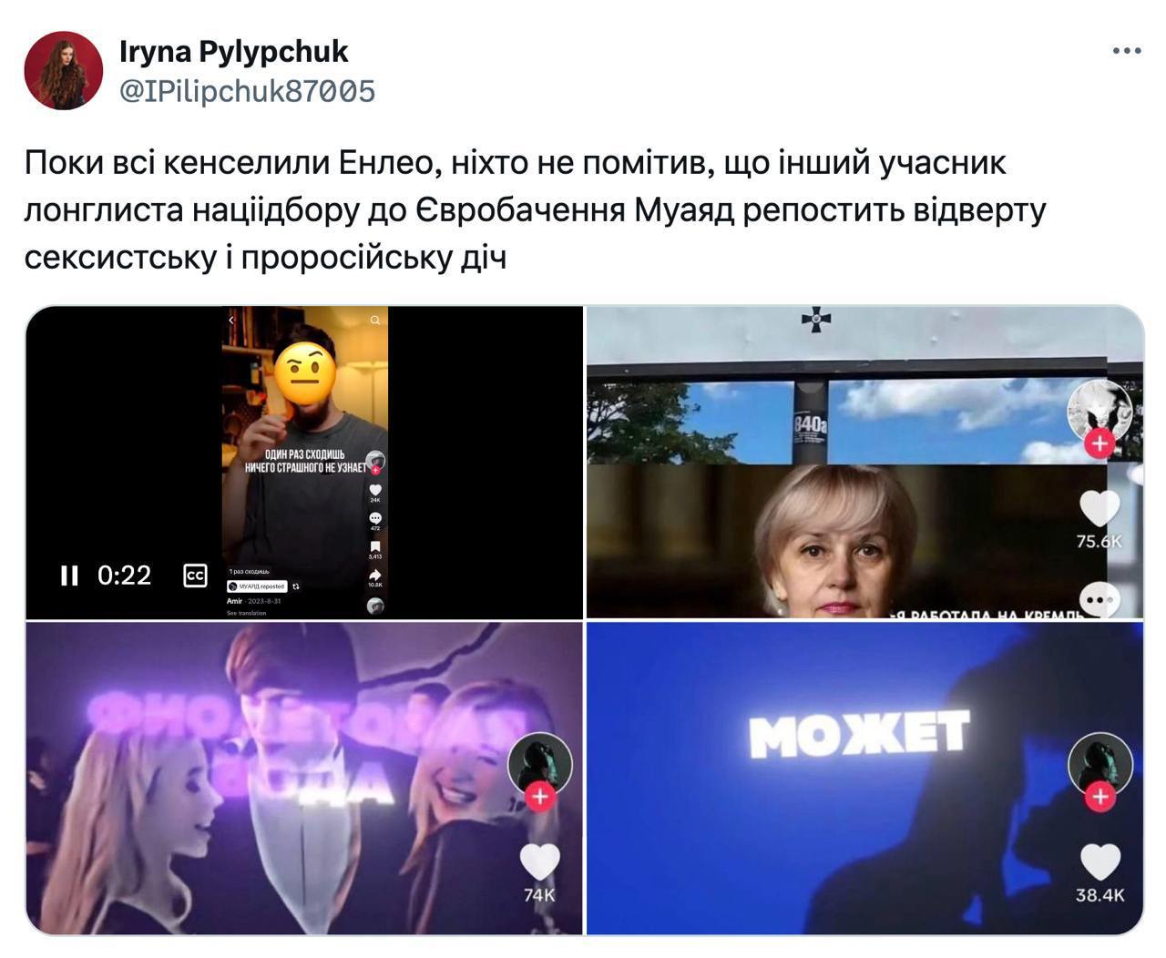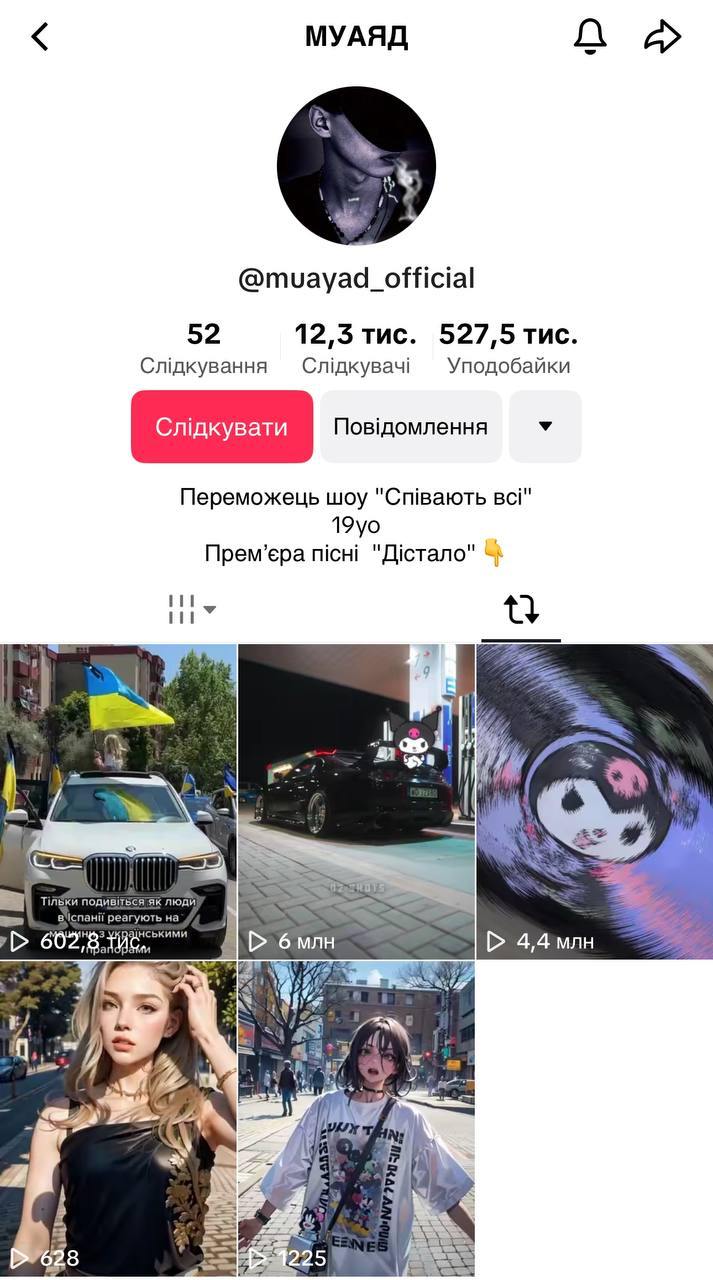 "Участник Нацотбора Муаяд молча поудалял неудобные репосты с ТикТока, оставил только патриотические. Кто-то додумался проверить его профиль на предмет репостов. А там - егор крид, шутки про Фарион-агентку кремля и прочая дикуха".