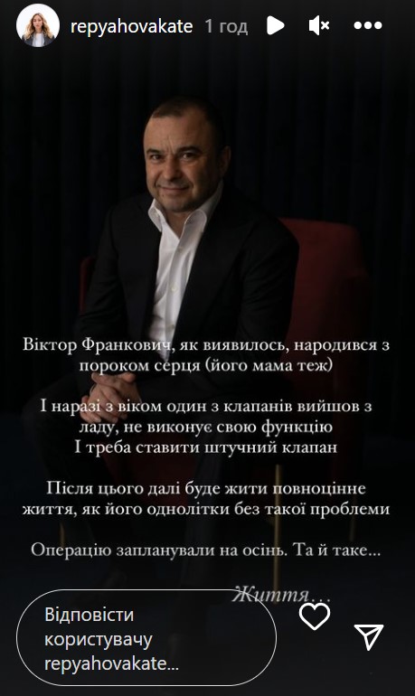"Виктор Франкович, как оказалось, родился с пороком сердца, как и его мама. И сейчас с возрастом один из клапанов вышел из строя, не выполняет свою функцию, и надо ставить искусственный клапан, - рассказала жена исполнителя. - После этого муж дальше будет жить полноценно жизнь, как его сверстники без такой проблемы. Операцию запланировали на осень. Да и такое… Жизнь…".