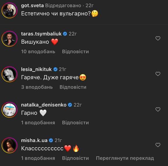 На пост отреагировал и Цымбалюк, который и сам снимался в ню фотосессиях, в том числе и с бывшей женой Тиной Антоненко. "Изысканно", - прокомментировал публикацию актер. Коллеги Тараса, актрисы Наталка Денисенко и Ксения Мишина, и телеведущая Леся Никитюк также оценили смелые кадры Готочкиной.