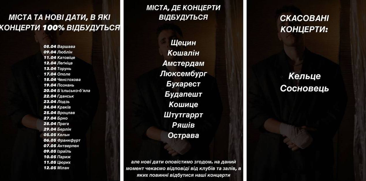 Зарубежный тур певца частично состоится по графику, впрочем начнется он 8 апреля с выступления в Варшаве. Большинство концертов были перенесены, 10 городов пока остаются без дат, 2 выступления пришлось отменить.