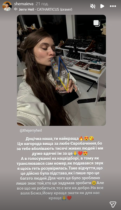 "Доченька наша, ты лучшая. Эта награда выше любого Евровидения, потому что за тебя болеют тысячи живых людей, и мы очень благодарны им за это. А в голосовании на Нацотборе, в том, как транслировался сам номер, как подавался звук, я что-то совсем разочаровалась. Такое ощущение, что это действительно была подстава, как и пишет об этом много людей. Для чего это было сделано, знает только тот, кто это задумал. Но все, что не делается – к лучшему. На все воля Божья", – написала мама исполнительницы.