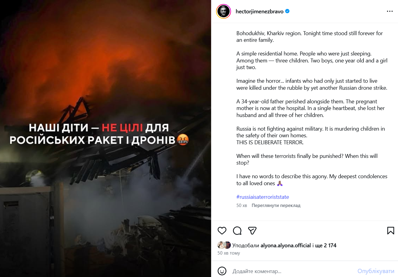 В своем Instagram он опубликовал эмоциональный пост на украинском и английском языках, чтобы об этой страшной истории узнали и его подписчики за рубежом.