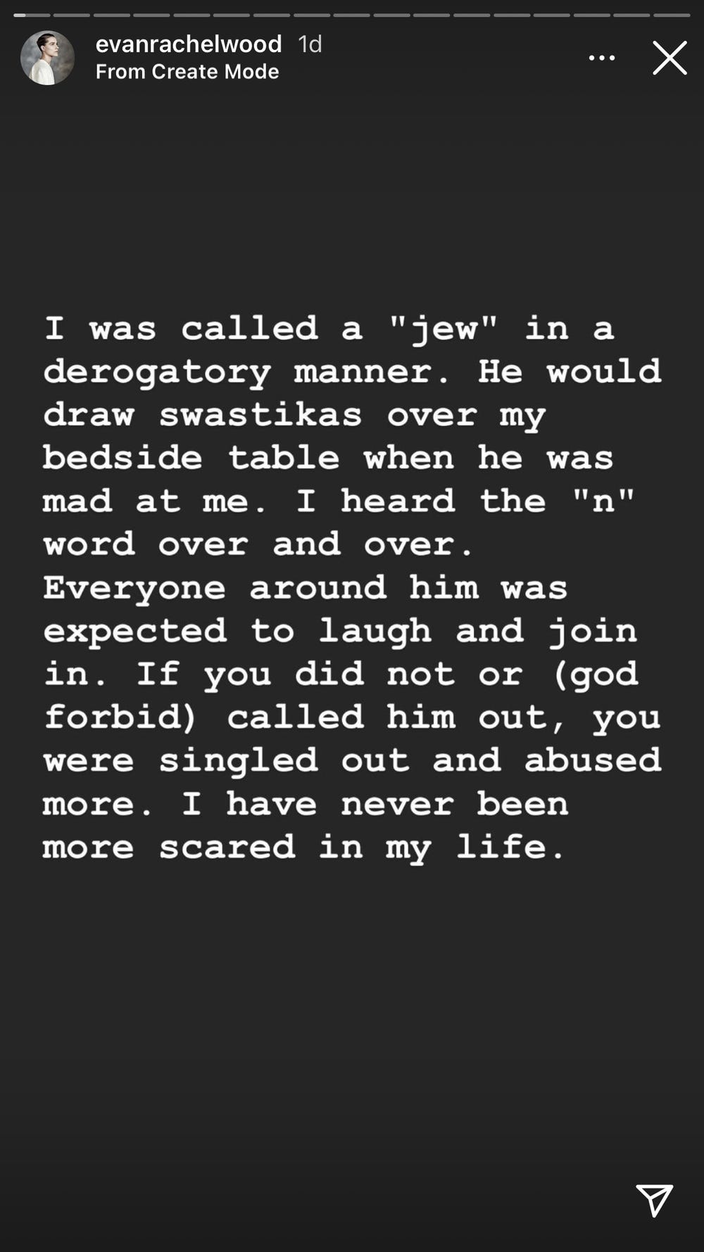 "Меня унизительно называли "еврейкой". Он рисовал свастики над моей прикроватной тумбочкой, когда злился на меня, - написала Вуд в Instagram-историях. - Я слышала N-слово снова и снова. Все вокруг должны были смеяться вместе с ним. Если вы не поддерживали или (не дай бог) осуждали его, вас оскорбляли еще больше. Я никогда в жизни так не боялась".