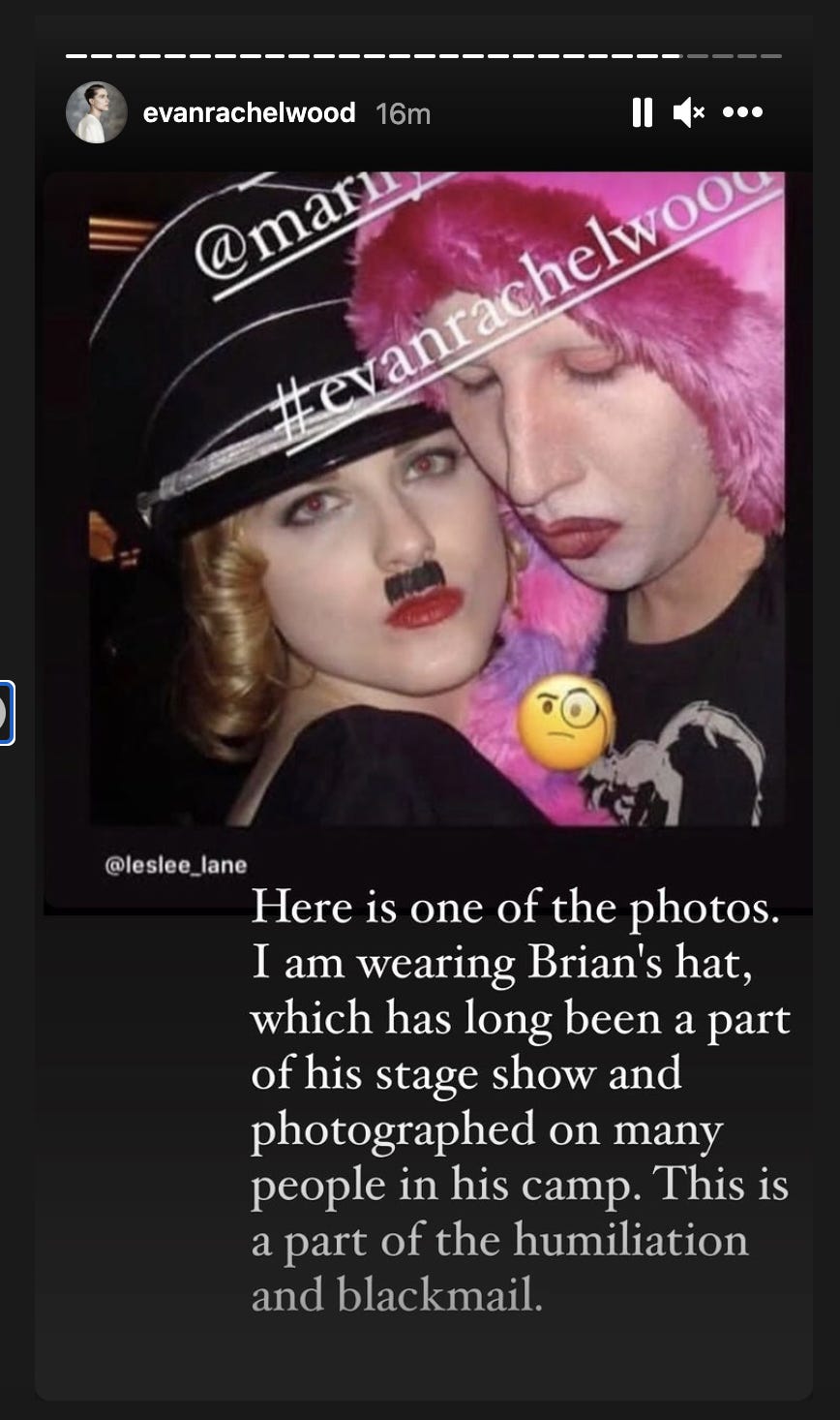 Также актриса сообщила, что в 2020 году подала заявление в полицию из-за предполагаемых угроз нынешней жены Мэнсона Линдси Юсич. Та, якобы, хотела опубликовать фото несовершеннолетней Вуд в фуражке офицера СС и с нарисованными усиками Гитлера.По ее словам, шапка была частью концертного костюма Мэнсона, а сама она находилась под воздействием алкоголя и наркотиков.