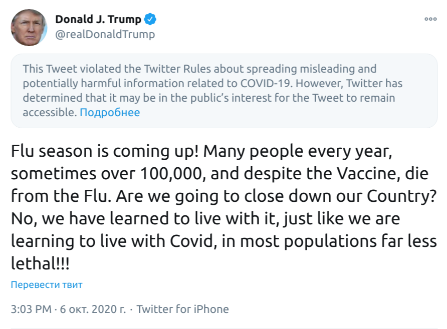 Facebook удалил пост Дональда Трампа, в котором он утверждал, что коронавирус "менее смертоносен", чем грипп. Получив положительный результат ПЦР-теста и проведя 3 дня в больнице, 74-летний президент США так и не избавился от скепсиса по отношению к Covid-19.