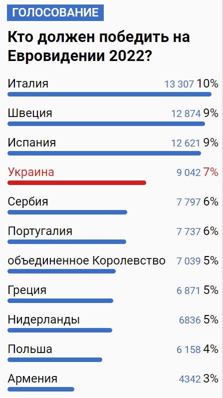Так, можно увидеть, что на первом месте оказалась Италия, за которую фанаты отдали более 13 тысяч голосов. На втором – Швеция с количеством голосов 12 874. На третьем – Испания, набравшая немного меньше голосов, чем Швеция. На четвертом – Украина. В победу нашей страны верят чуть более 9000 пользователей, уже успевших проголосовать.