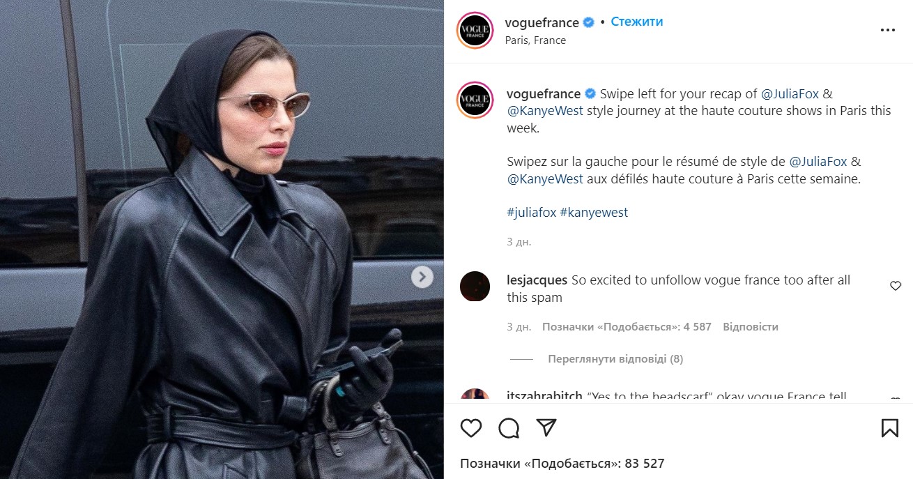 "Да платку! Листайте влево, чтобы узнать, в чем появились Джулия Фокс и Канье Уэст на показе высокой моды в Париже на этой неделе", - гласила подпись к скандальному посту. Через некоторое время он был отредактирован – исчезли все ссылки на черный платок, в котором позировала Фокс. А также было удалено выражение "Да платку!".
