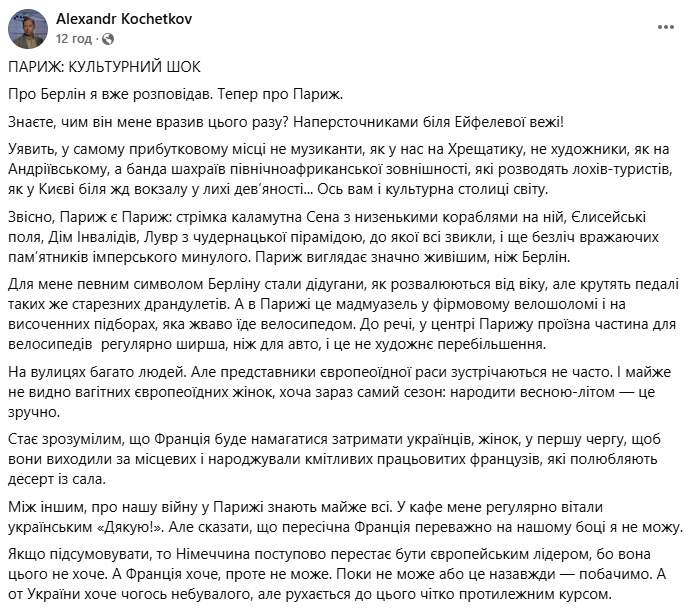 Согласно словам Кочеткова, там почти знают о войне России с Украиной: "В кафе меня регулярно приветствовали украинским "Дякую!"". Но он не может утверждать, что рядовая Франция преимущественно на нашей стороне.