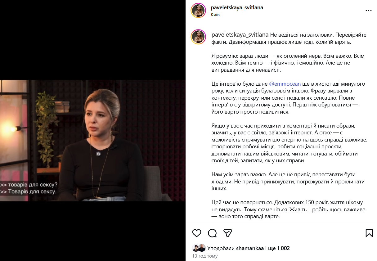 В ответ на хейт Павелецкая опубликовала эмоциональный пост в Instagram, в котором подчеркнула, что скандальную цитату вырвали из контекста и подали манипулятивно.