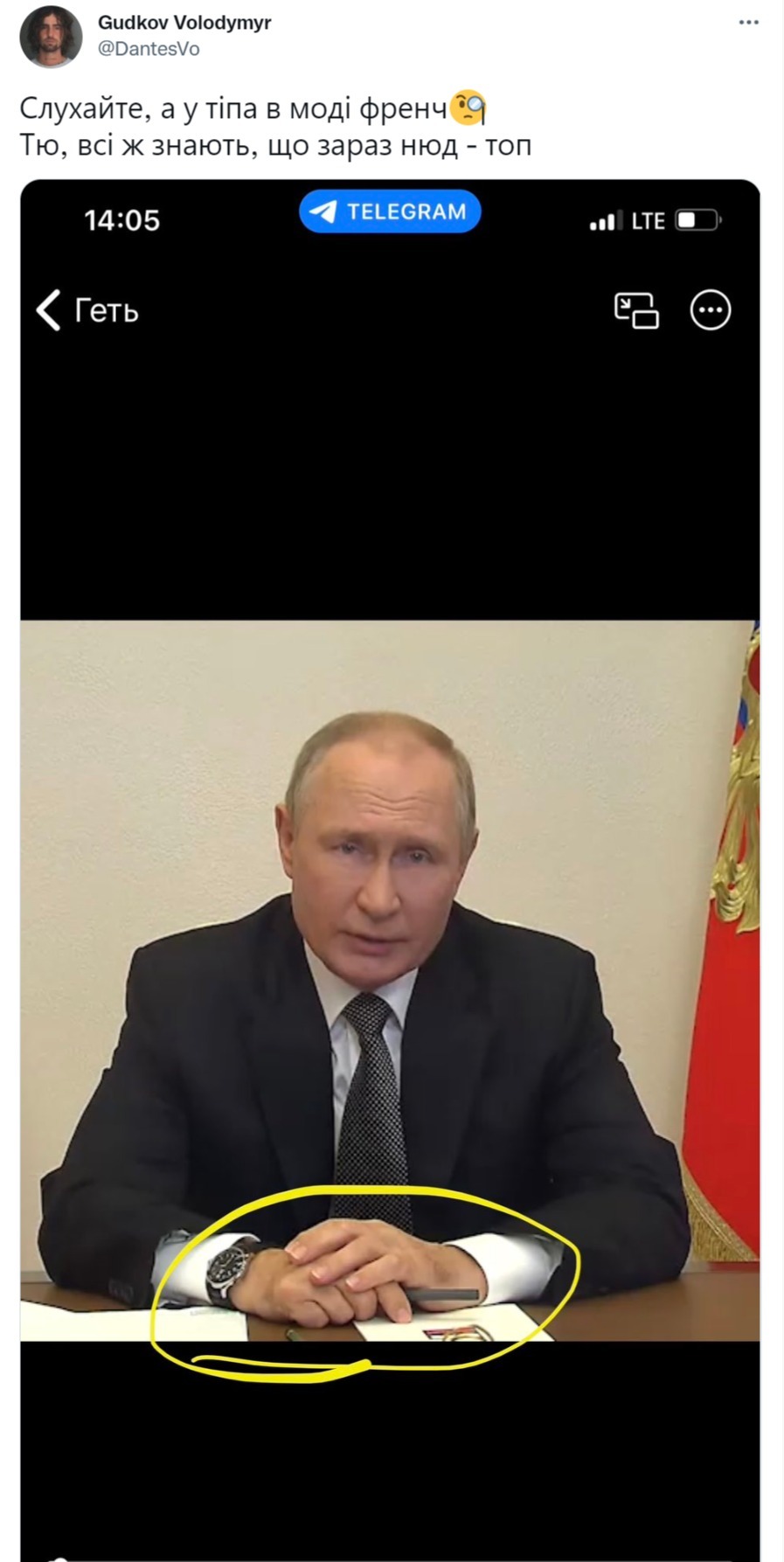 Украинский исполнитель Владимир Дантес (настоящая фамилия - Гудков) посмотрел выступление Путина и обратил внимание на его руки. На стоп-кадре отчетливо видно, что ногти на левой руке диктатора длиннее, чем на правой. Дантес высмеял странный "французский маникюр" колким комментарием.