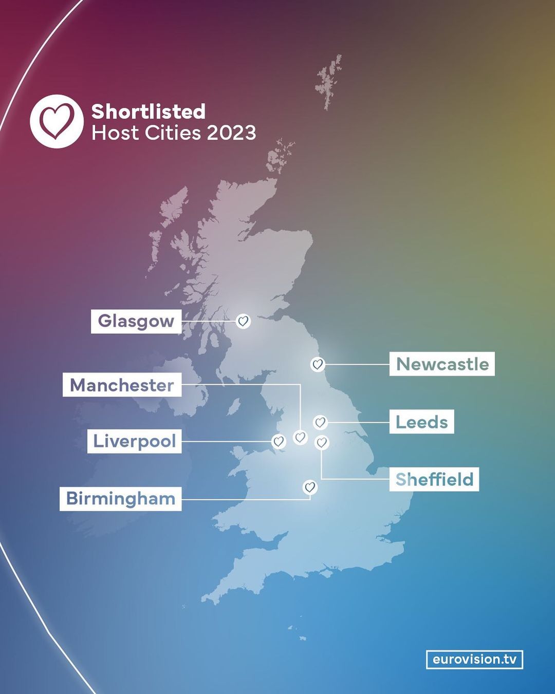 Так, Европейский вещательный союз вместе с BBC назвали такие города-претенденты: Глазго (Шотландия) и английские Манчестер, Ливерпуль, Бирмингем, Ньюкасл, Лидс и Шеффилд. В течение следующих недель организаторы будут проверять локации в каждом из указанных городов.