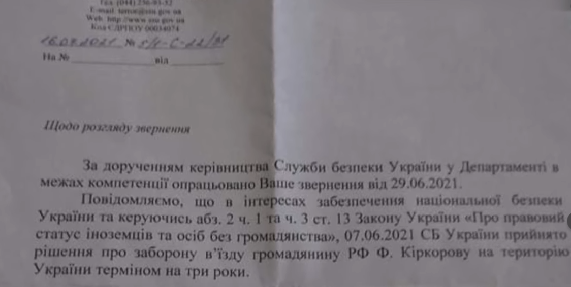 Скриншот ответа от СБУ Олегу Стефанику, который поступил 16 июля, блогер опубликовал на своем YouTube-канале 3 августа. При этом Стерненко отмечает, что концерты Киркорова по-прежнему можно транслировать на украинском телевидении и радио.