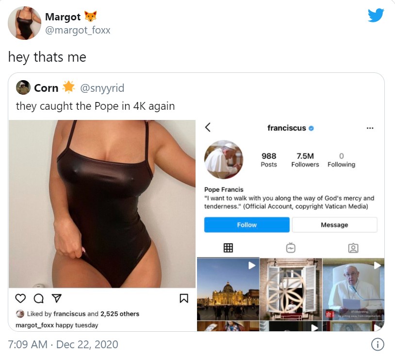 Instagram-модель Марго Фокс похвасталась подписчикам особым лайком под одним из своих фото в обтягивающем купальнике. Похоже, у главы католической церкви, Папы Франциска, снова дрогнула рука. Хотя не исключено, что грешит не он сам, а его СММ-щик.