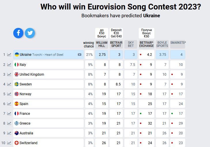 В десятку фаворитов "Евровидения-2023" также входят Испания (4%), Франция (4%), Греция (3%), Австралия (3%) и Швейцария (3%).