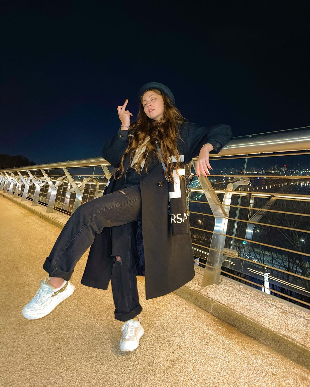 На одном из фото, опубликованном в Instagram, юная блогерша стоит на мосту на фоне вечернего города. Одной рукой она облокотилась на перила, а другой показывает средний палец. "Немного эстетики ночного Киева, а вы любите гулять ночью??", - поинтересовалась она у фолловеров.