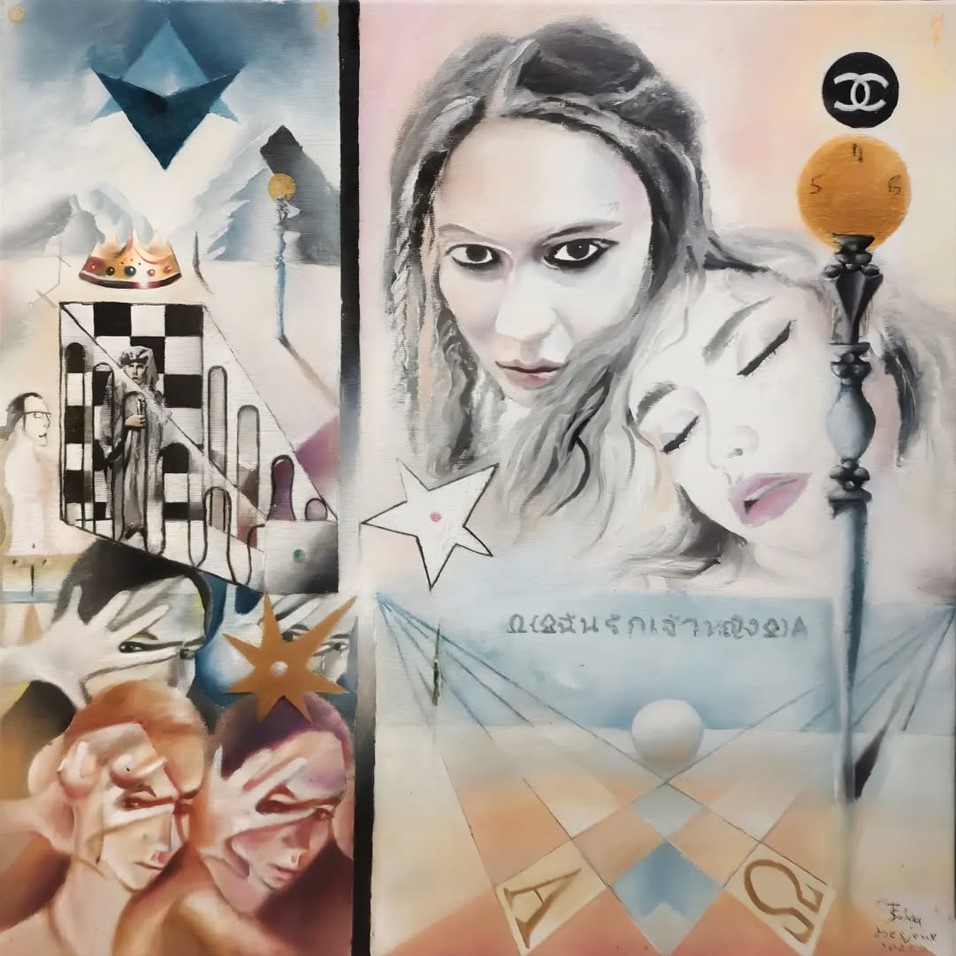 В представленных работах художник совмещает многослойные образы, символы, личные истории и философские спекуляции.