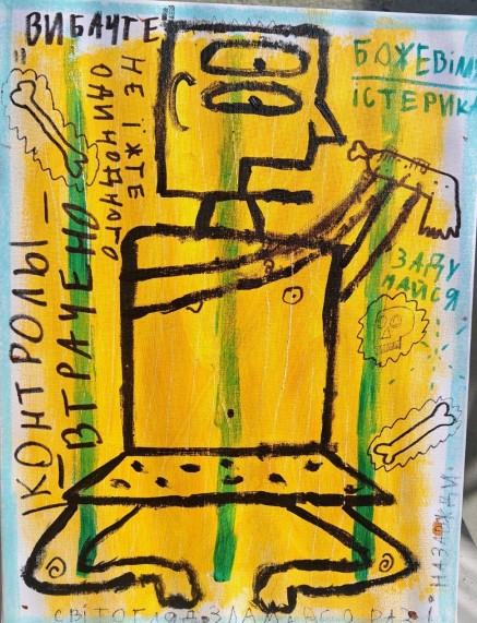 Андрей Юзба работает с эмоциями, спонтанностью и текстом, как частью визуального языка. Его работа "Вещительный Каннибал" является прямой реакцией на агрессию и самоуничтожение в обществе.