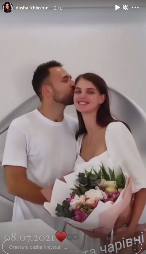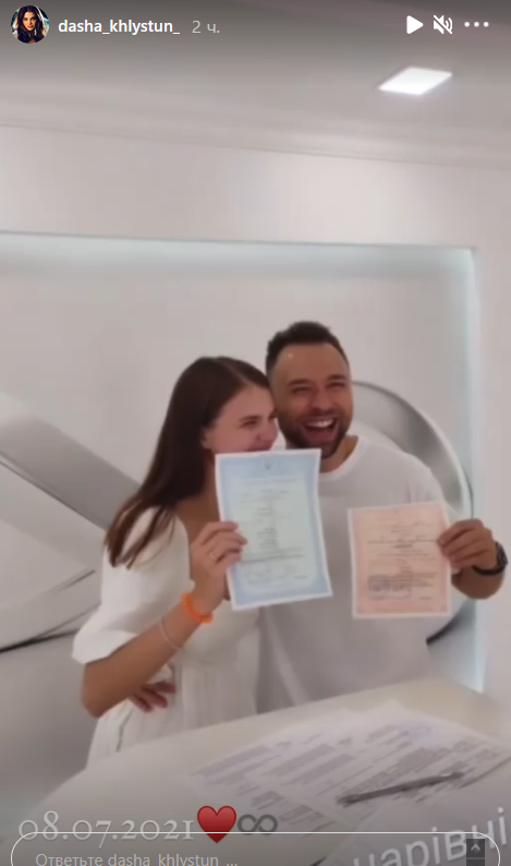 Молодые родители тайно сходили в загс, а уже на следующий день поделились первыми снимками в Instagram. Даша опубликовала в "сториз" несколько кадров с церемонии и написала: 08.07.2021.