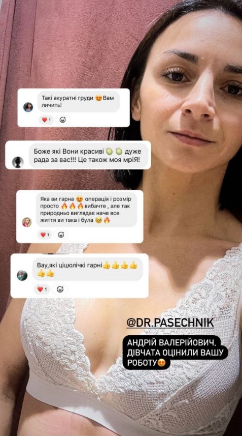 Подписчики отреагировали на stories звезды и засыпали ее комплиментами по поводу новой груди. "Такая аккуратная грудь. Вам идет!", "Какая она красивая! Очень рада за вас! Это тоже моя мечта", "Какая вы красивая, операция и размер просто огонь! Извините, но так естественно выглядит, будто всю жизнь так и было", – говорится в некоторых комментариях.